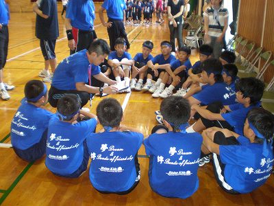 前日交流戦で元気にあいさつ。この後、思わぬ再会が・・・、「塚田先生に理科を教えてもらいました!」という五本松チームの保護者の方が名乗り出てくれました。30年前のO中学校の卒業生NKさんでした。 |
